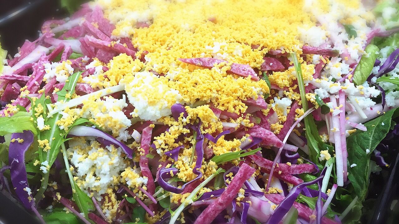 クリスマスをイメージしたミモザサラダ!紫色の野菜を使うと、グッとモダンなイメージになります。