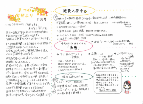 先月の台風の影響により、各地で大きな爪痕を残し、被害に見舞われた皆さまに、心よりお見舞いもうしあげます。また、休配やスライド納品でご迷惑おかけいたしました。大変な状況の中、ご理解・ご協力を頂きまして、誠に有難うございます。