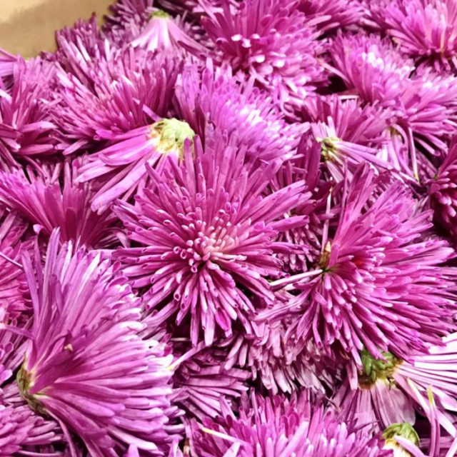 黄色いキクでも花びらが細いものや幅のあるもの、薄い紫色で花びらの幅が広いキクなど、品種改良が進んでいるため、さまざまな種類があります。キクによって、苦みが強かったり、甘味が強かったりと、好みによって栽培するキクが違うようです。