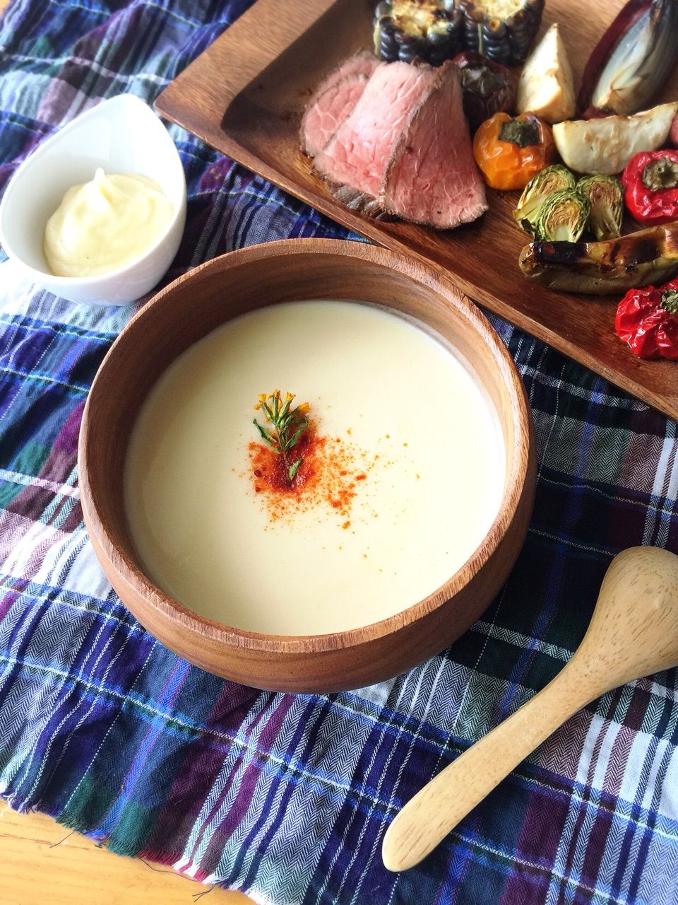 そして、先程のポタージュになる前のセロリアックのピュレに、塩、胡椒で味を整えディップにしました。オーブンで焼いた季節の焼き野菜、ローストビーフ、パンにつけていただきます。どれもとっても簡単に、セロリアックを存分に楽しめるお料理になりましたよ。国内ではまだなかなか馴染みの薄いお野菜ですが、セロリアックをお見かけしましたら、是非この香りに癒されてみて下さいね。
