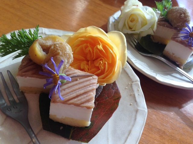 切り干し大根、秋刀魚の甘辛煮、ナポリタンリンゴのワイン煮、西明寺栗の渋皮煮、コールスローイチゴドレッシング、いものこと栗の煮物、レンコンとニンジンごぼう煮ニンジン甘酢漬け、レタスサラダ、キノコのオリーブオイル焼き、カブのピクルス、きのこ汁、 コーヒー、栗のケーキ・・・