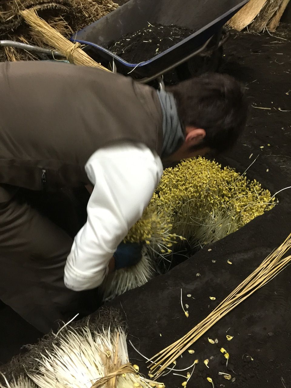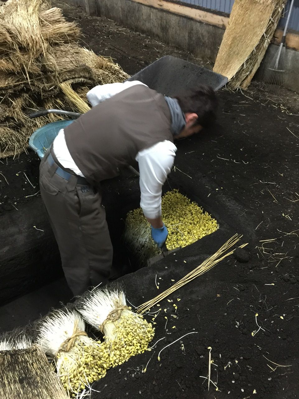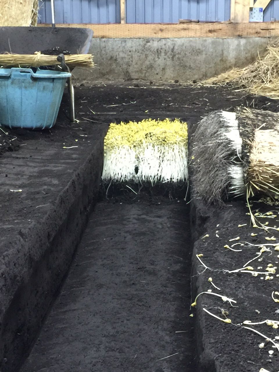 幅、深さ40〜50センチ、 長さ5メートルの「サワ」と言われる土床にびっしり! 根から30〜40センチ程の長さの「温泉もやし」が育っていました。 この日は取材のため分かりやすいように 残してくれていました。