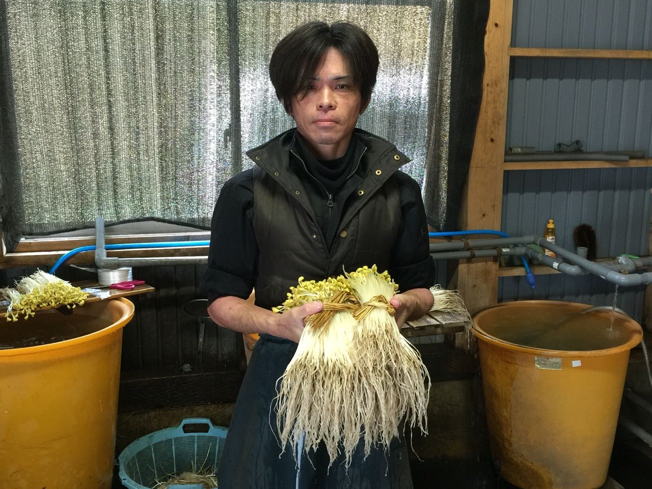 ここで山崎さんご夫妻を師とし 「大鰐温泉もやし」伝承後継者として 就業7年目で、さらに若手の「八木橋もやし」八木橋祐也さんと順さんのお二人を紹介いただき、作業場を見せていただきました。