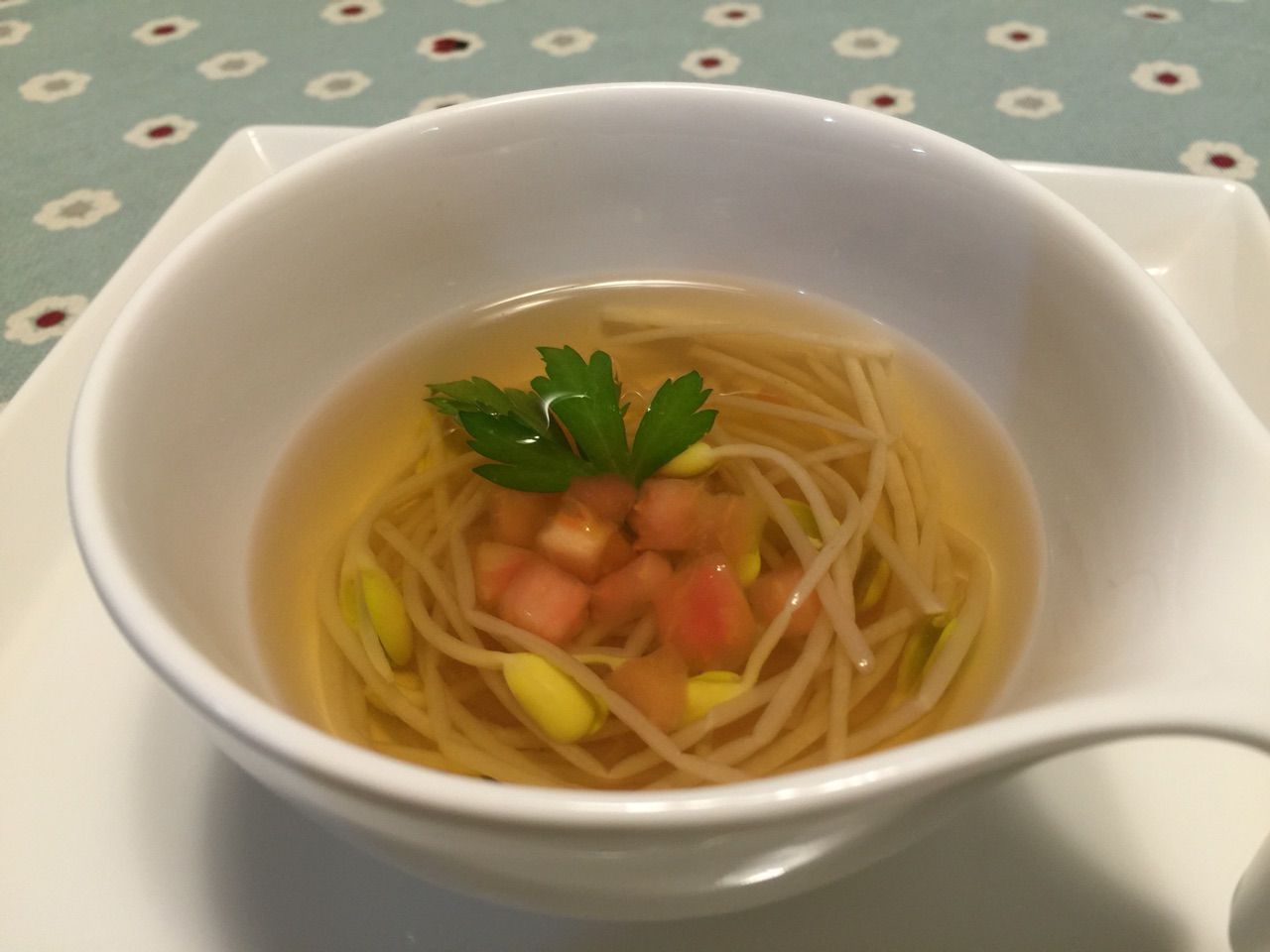 「温泉もやしの」長さを生かして素麺風にトマトを加えナンプラースープでいただきました。