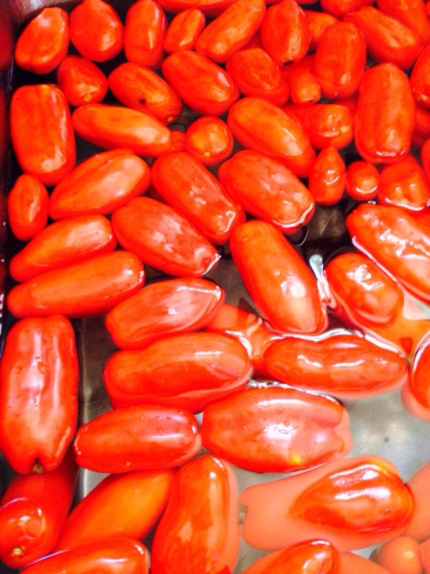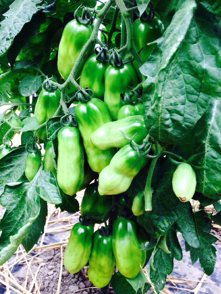 岡村さんの農場で栽培されているサンマルツァーノという品種のトマトです。イタリアの代表的なトマトで加熱することにより粘りのある独特の旨味が出る調理用のタイプです。 真っ赤な色がとても綺麗なトマトです。色々な品種を試してみて、サンマルツァーノに出会ったとのこと。 病気に弱く、管理にとても手間がかかりますが、農薬はなるべく使用せず大切に育てていらっしゃいます。