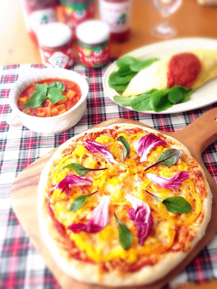 ケチャップは子供達も大好きな定番のオムライスに。玉ねぎと大豆と炊いた玄米ご飯のケチャップライスにしました。ピザソースでオレンジカリフラワーのピザを焼いてみました。ピザソースと23㎝のピザ生地に、オレンジカリフラワーを2分の1玉敷き詰めて、黄パプリカとオレンジパプリカを適当量で。お野菜だけとは思えないとっても美味しいピザが出来ましたよ。是非お勧め致します。彩りにはレッドビートの葉とトレビスを飾ってみました。そして、そのピザ作りで出たお野菜の余りと玉ねぎ、大根をトマト鍋の素と同量のお水とで簡単に贅沢なトマトスープが出来上がりました。
