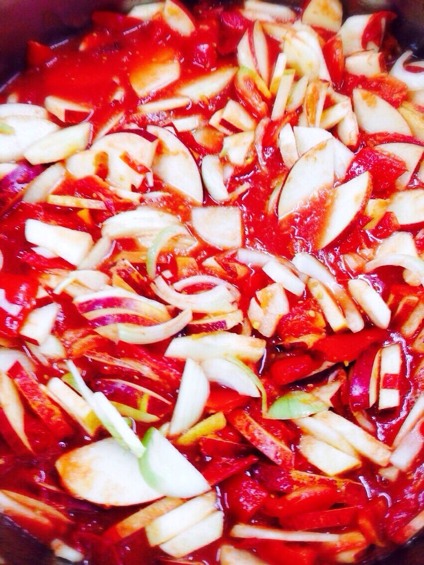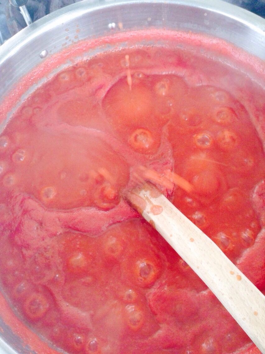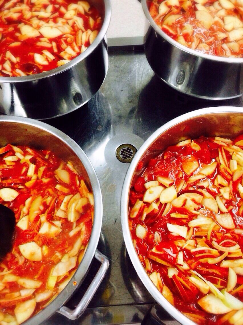 自然解凍したサンマルツァーノと北海道産のリンゴ、江別産の玉ねぎ、砂糖、穀物酢、食塩、江別産のしょうが、江別産のにんにく、コショウ、シナモン、パプリカ、オールスパイス、ローリエを煮ていきます。無添加の手作りケチャップです。