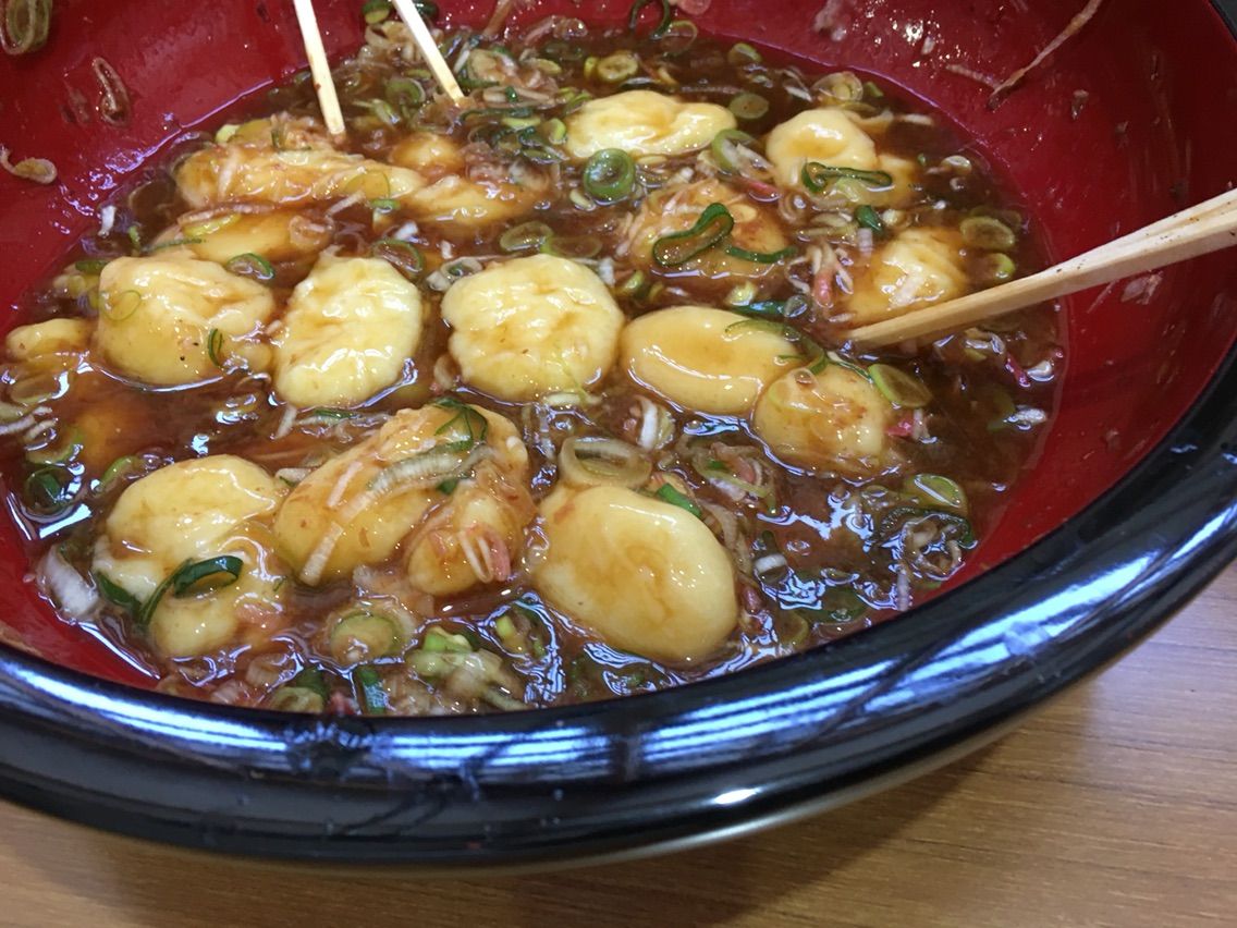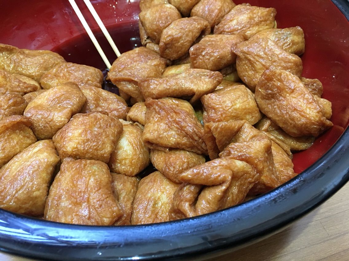 甘辛く炊いた油揚げの中に一口大にちぎったお餅を詰めたもの。