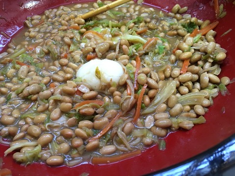 一関市川崎町に伝わる食べ方で、納豆と野菜を炒め、醤油ベースの味付けにしたものにお餅を和えます。