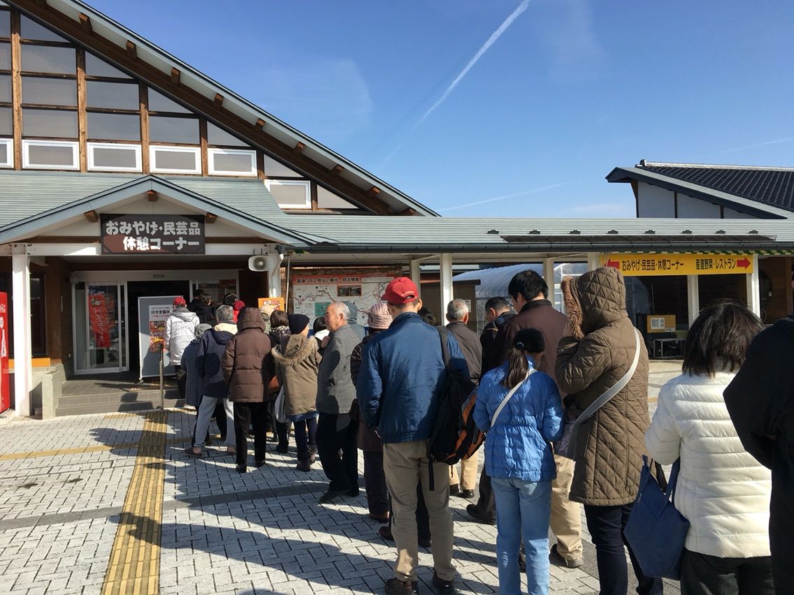 会場の道の駅厳美渓(げんびけい)は一関市博物館に隣接し、景勝地厳美渓や平泉にほど近く、日頃から観光客で賑わっています。11時の開場を前に既に行列が出来ていました。