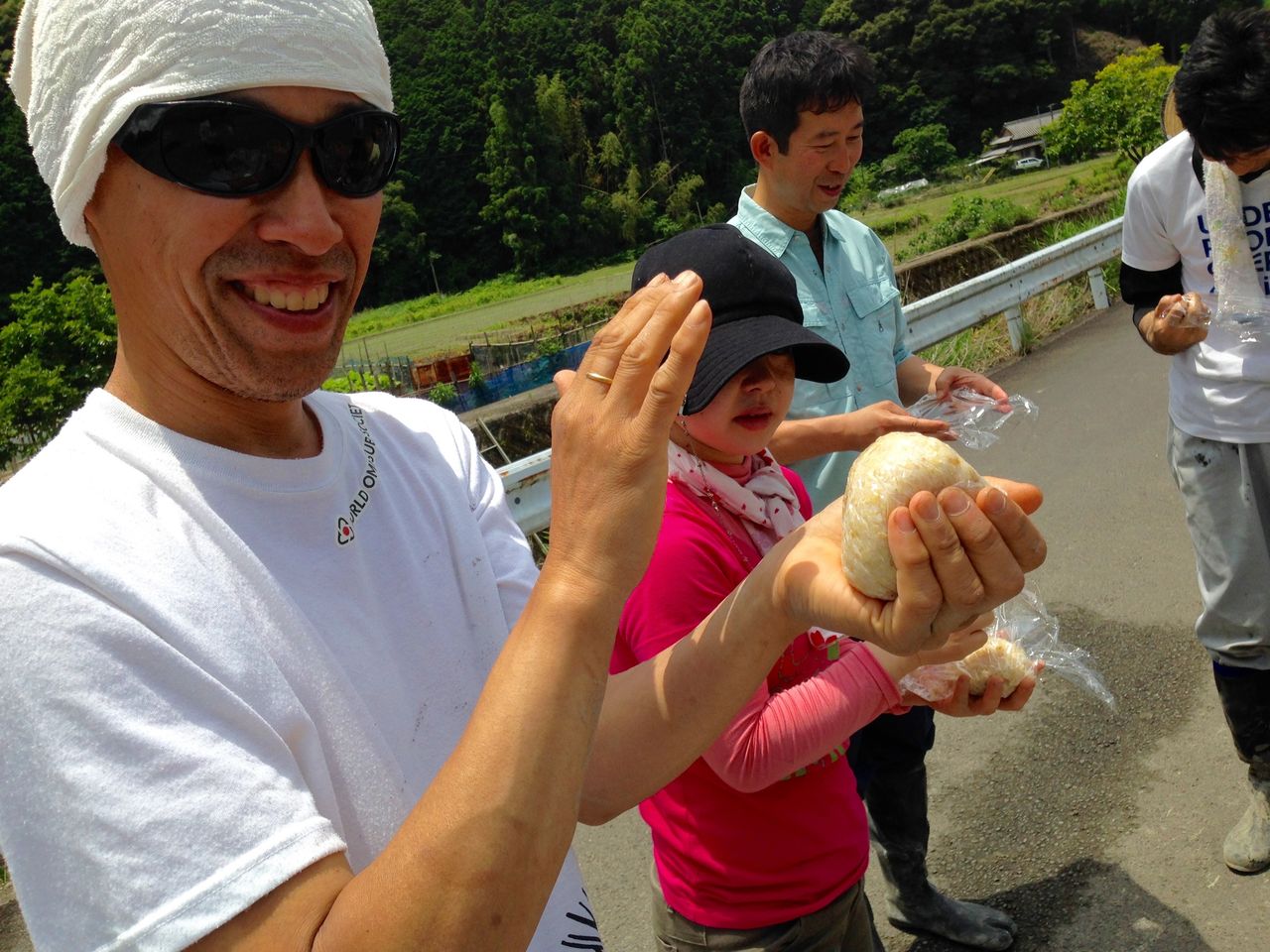 香ばしい匂いと共にご飯が炊けました。 田植え後の、もう一つのお楽しみは、有機コシヒカリのおむすび作りです。
