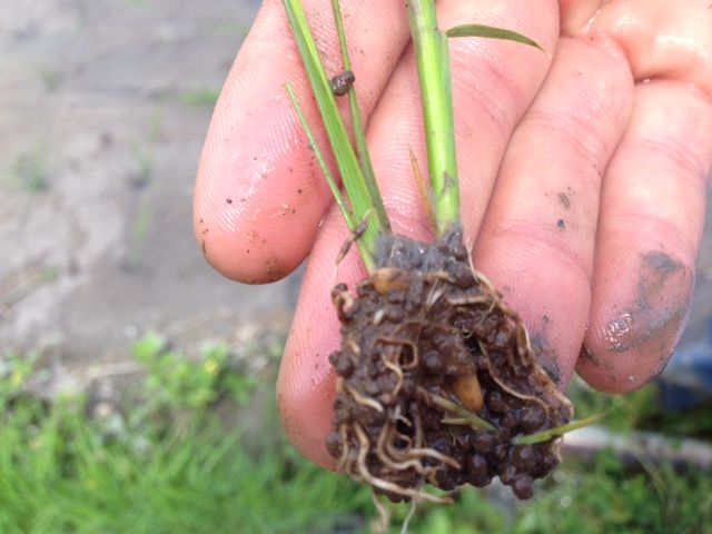 ジャンボタニシは柔らかい草を好んで食 べます。その生態を利用して、苗は大きめの5.5葉までポットで生育してから植え るなどの工夫がされています。