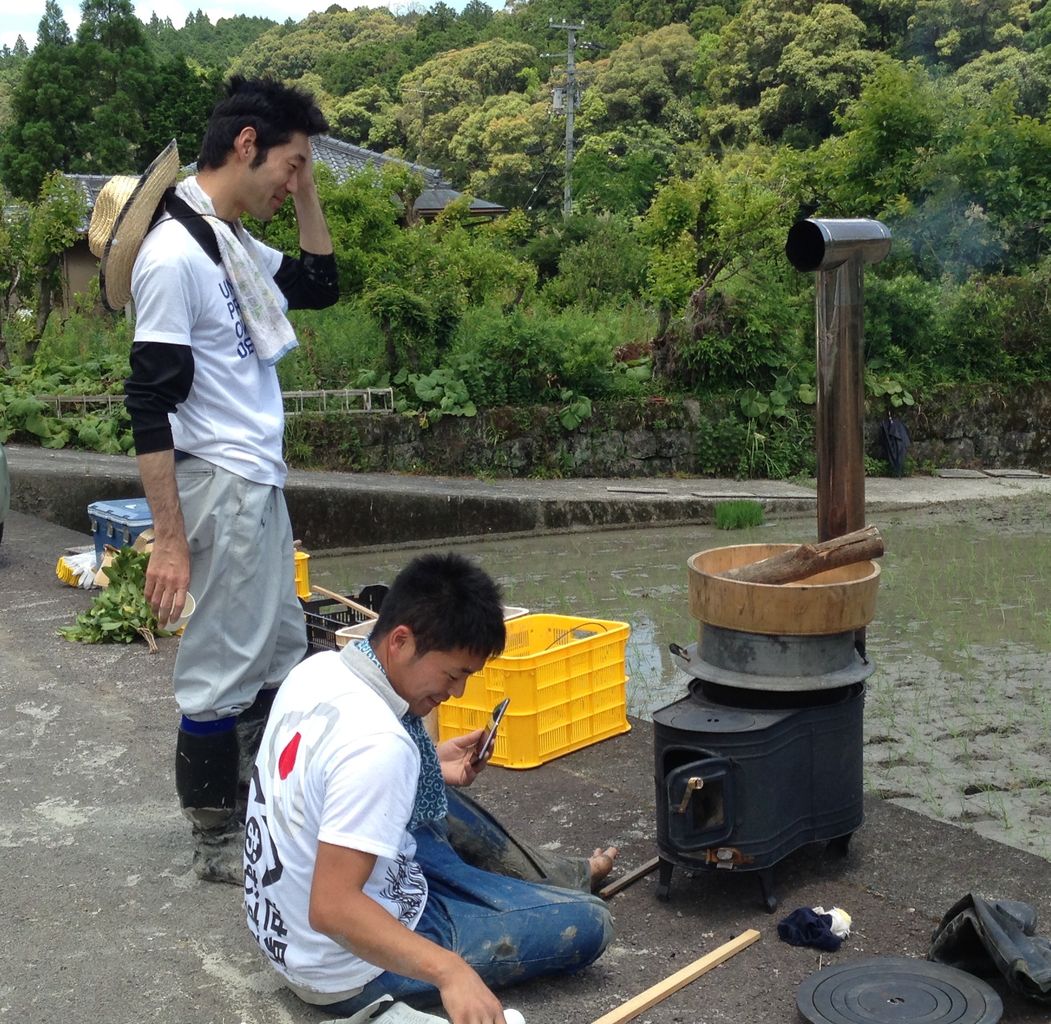 田植えをしているといい匂いがしてきま した! 羽釜で有機コシヒカリを焚いています。 鳥谷さんは有機コシヒカリを主に作っ ています。
