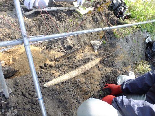 栽培方法を聞くと、まず半分に切った雨どいのようなパイプを使用するそう。そこに砂を敷き詰め地中に埋めて、地上に等間隔に置いた種イモに土をかぶせ、根をパイプに誘引する。パイプに沿って成長させる仕組み。そうすると、まっすぐな自然薯ができます。掘り起こすにも作業がしやすいそう。種イモの周りには栄養が必要ですが、パイプの砂は栄養は入れません。そうすると真っ白で灰汁のない自然薯が育ちます。