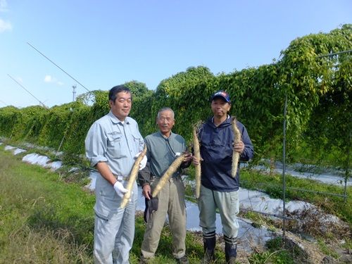 収穫は注文が来てから1本づつ丁寧に傷がつかないように掘り起こします。大きさは1本0.7kgから1kgにも。西条自然薯研究会副会長の白石幸二さんは「売価を自分で決められるので、希少価値のある農作物を作りたいと思った」と自然薯を栽培しようと思ったきっかけを話してくれました。和歌山や茨城の産地を訪ねて、研究を重ねてきたそうです。