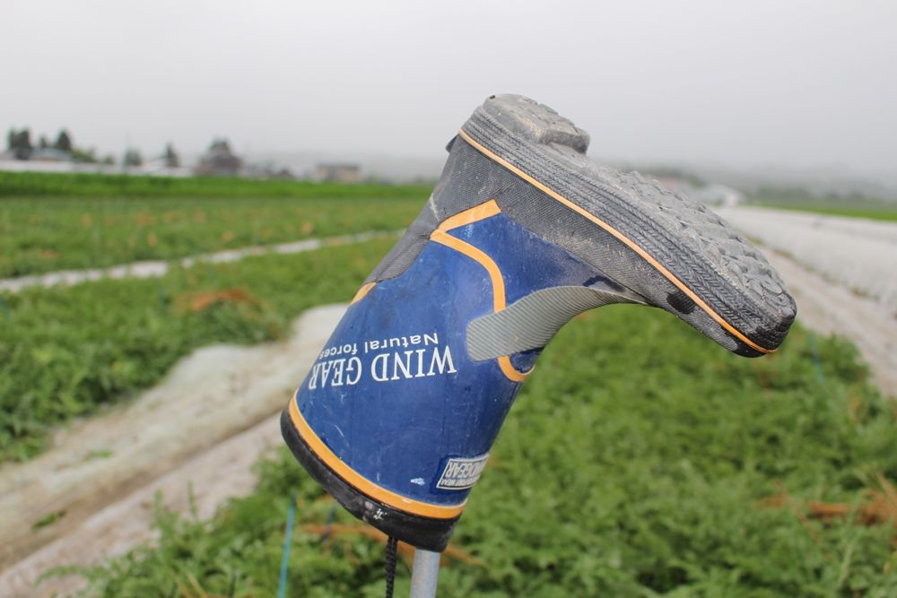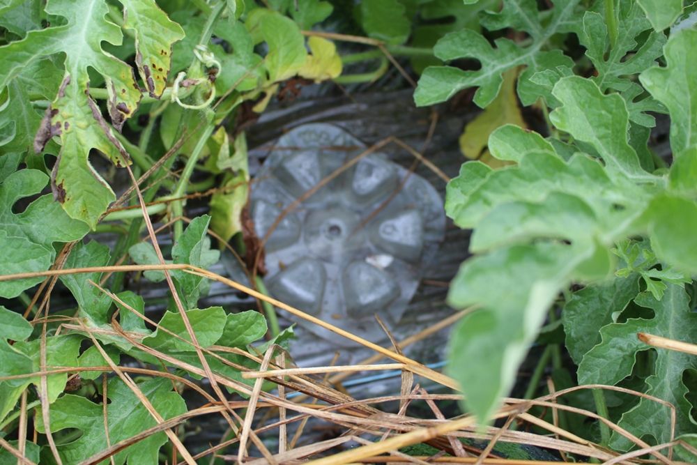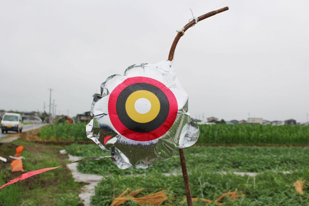 このような計画のもとに、栽培されています。わたしは普通栽培の収穫初日7月24日にお邪魔しました。1床の長さは 5m40cm×160m、長ーい畑です。自然に恵まれた場所という事もあり…タヌキやカラスが、甘くて美味しいスイカを狙ってやってきます。その防除対策が…3点セット①②③