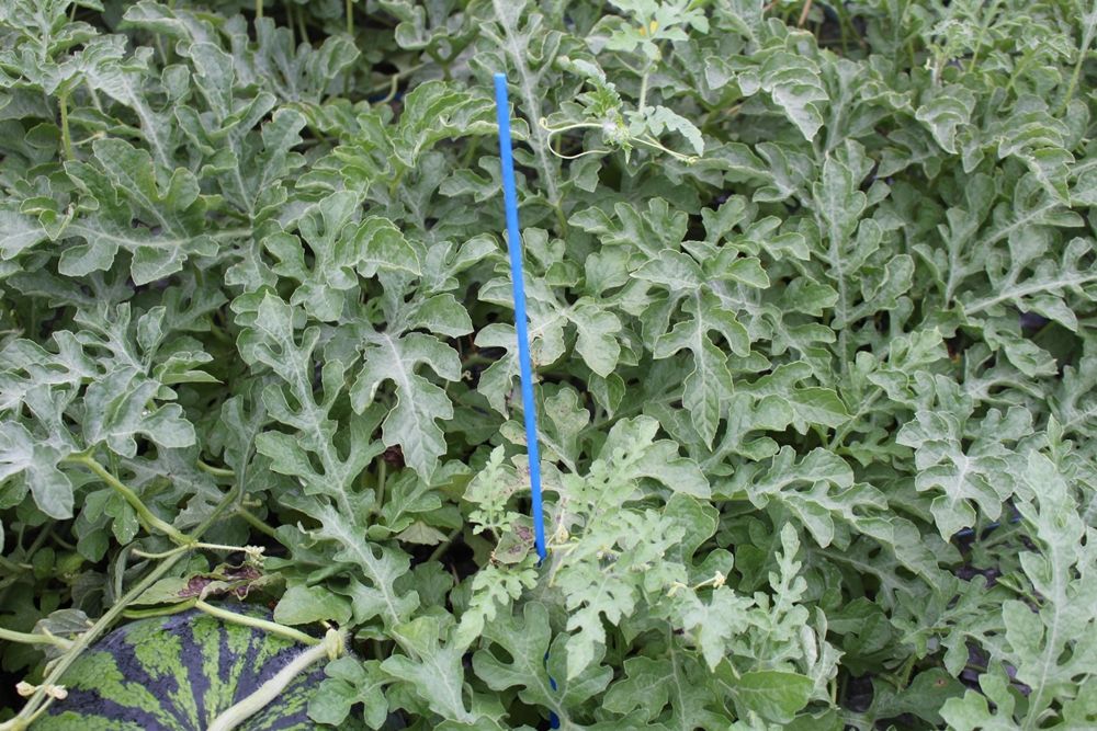 辻田さんの手によって、大事に大事に育てられている箱入り娘の 「あきた夏丸」。スイカの1個1個には、赤、青、黒 のいずれかの棒がささっています。育ち具合によって、各期を3グループに分け、3日間の収穫日を、わかりやすくふりわけているのだそうです。