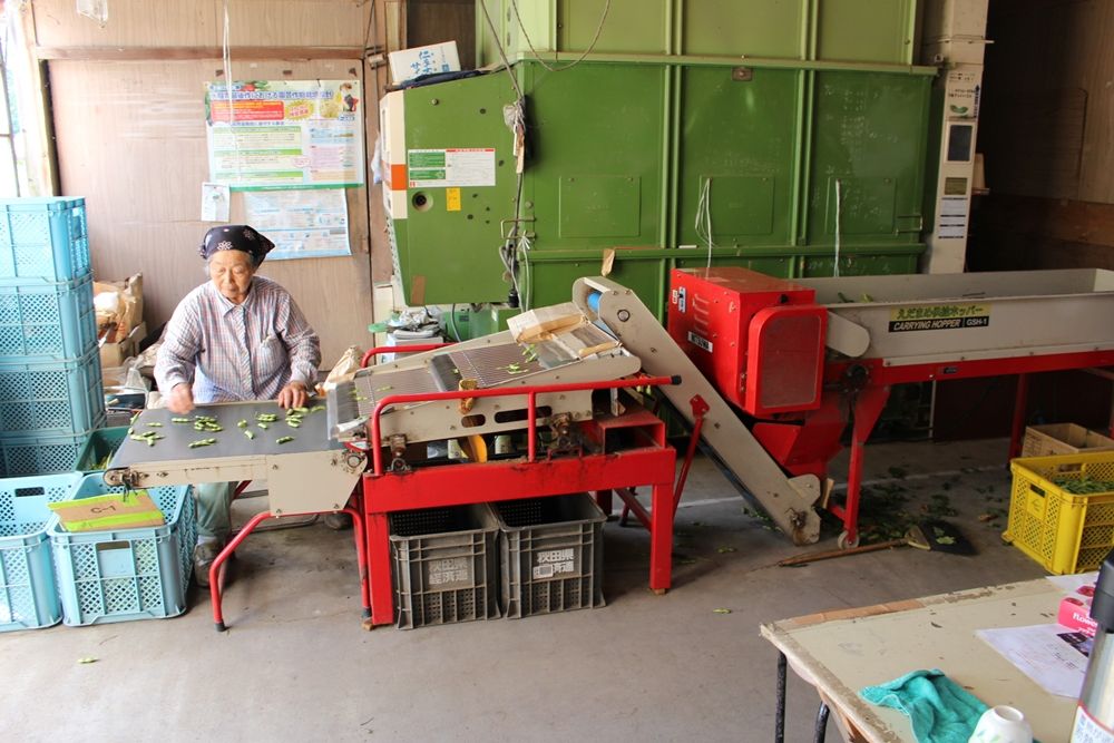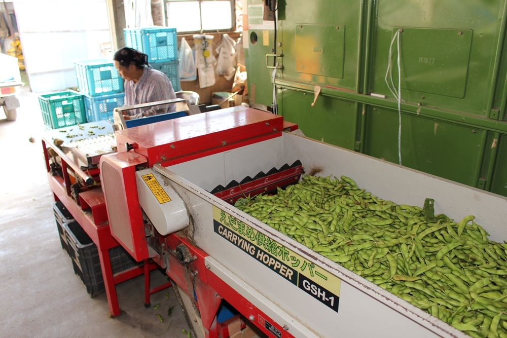 普通枝豆の葉は3枚ですが、5枚あるのが特徴です。9月上旬に収穫予定となっています。清水川さん、わたし、共にイチオシは「あきたほのか」。秋田には4つのオリジナル品種があり、その中で1番新しい品種です。香りが良く、甘みがあって、食味の評価が高い枝豆です。こちらは、時期をずらして播種し、9月初旬から10月初旬まで、4回収穫の予定となっています。お邪魔した際に出荷準備をしていたのは、「恋姫」。甘みが強く、食べ応えのある大莢の枝豆です。畑から採ってきた枝豆は、機械で莢を外し、