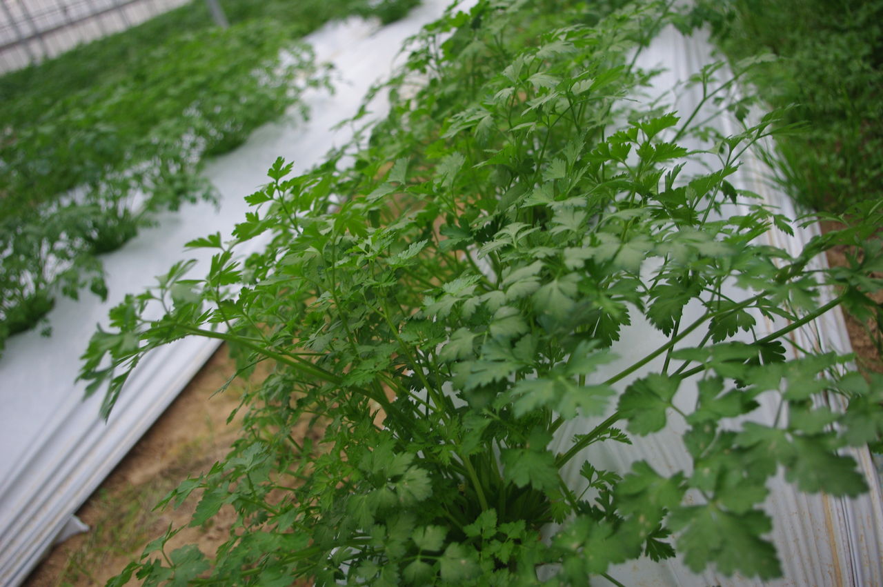 収穫は葉がシャキッとしている早朝、6時から8時の間に行われます。昼間は朝に比べると葉がくたっとしているそうです。(写真は午後の圃場です)そして隣のハウスではイタリアンパセリも発見しました。