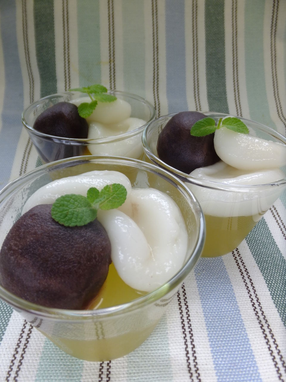 ④固まったお茶寒天に餡子と白玉を載せミントを飾って完成。