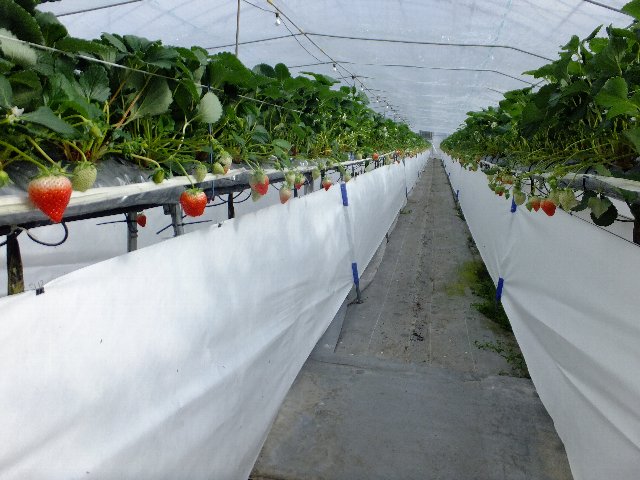 「苺の色づきは温度だけじゃなく日照時間も重要。反射シートを使って苺に光が乱反射するように工夫しています」と酒井さんは話してくれました。 苺のハウスの中はとても整然として綺麗。14アールの広さで高設栽培していますが、足元にゴミひとつ落ちていないのです。美味しさの秘訣は行き届いた細やかな栽培管理。そして、生産履歴の記帳など安心安全な苺づくりに力を注いでいます。水やりはハイテク。日照量をコンピューターで計測して5万ルクスで1回灌水するようにセットしています。水や液肥の量は生育状況を見てこまめに調整することで美味しい苺ができます。