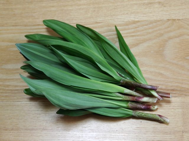 ギョウジャニンニクは、地面に出たばかりのものから若い葉を鎌などで根元から収穫します。北海道では早春ごろからお店に並び始めますが、葉がまだ開いていない棒状のものがトレイに10株程入ってラップをされた状態や、上の写真くらいの葉のおおきさ、開き具合で、直径3センチほどの束に輪ゴムなどで束ねられた状態で販売されています。ギョウジャニンニクはその名の通り、ニンニクの香りがします。葉は鮮やかなグリーンでツルツル。マットな質感ながら、水をはじきます。
