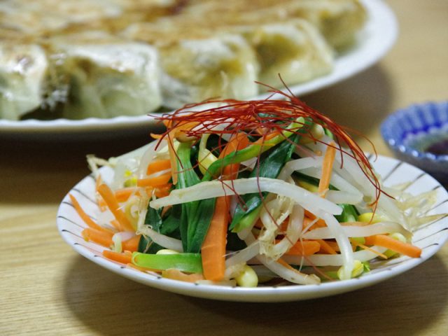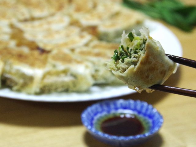 緑色の葉とにんにくの香りは、ニラとニンニクの代わりにもなり、一人二役です。今回は沢山ありましたので、たっぷり入れました。ギョウジャニンニクの風味が効いた餃子となりました。