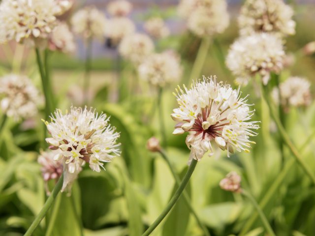 夏になると、ネギ坊状の可愛らしい白っぽい花を咲かせます。