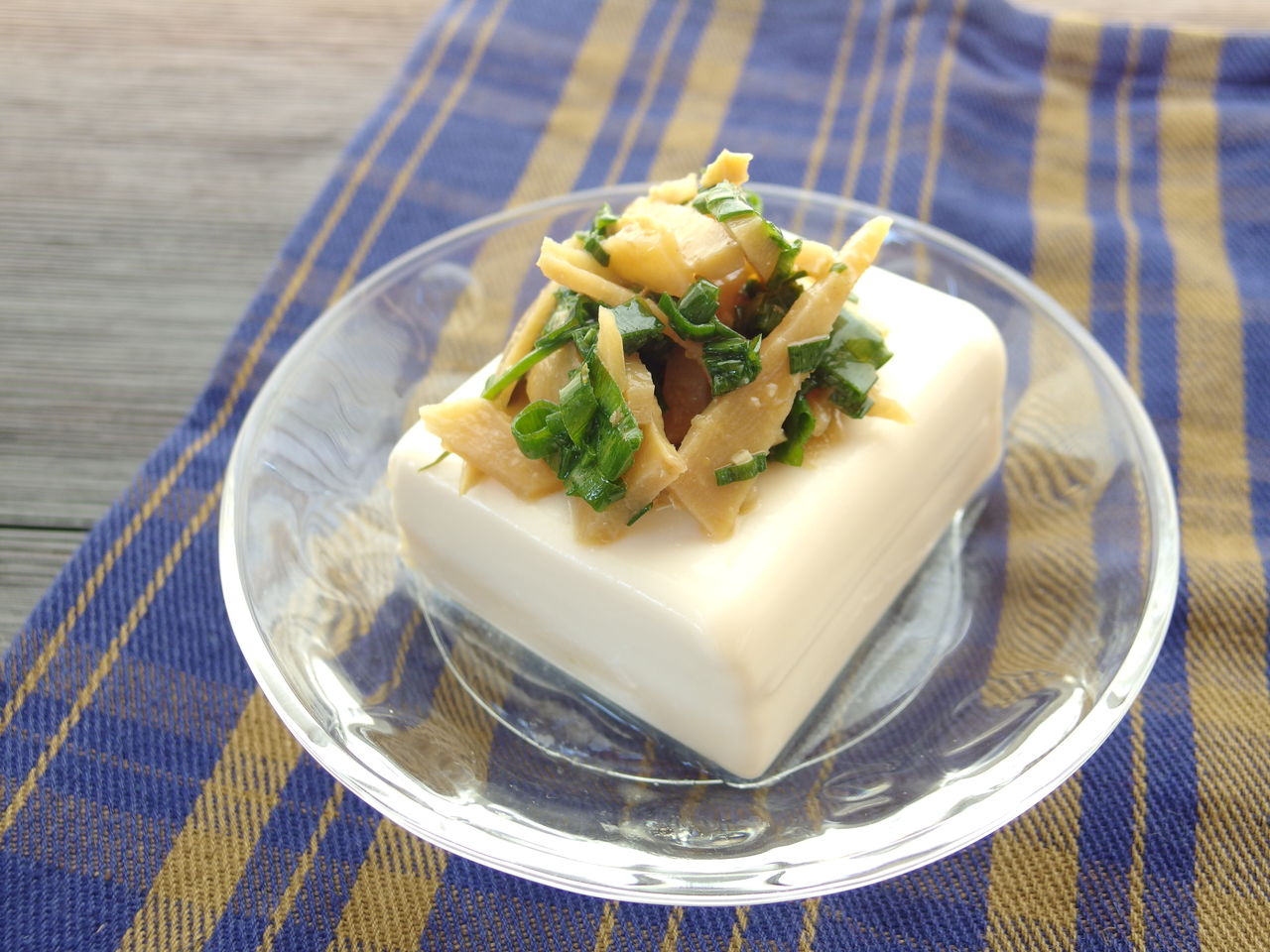 細切りにしたメンマと小口切りの小ネギをおろしにんにく、豆板醤、お酢、ごま油で和えて。
