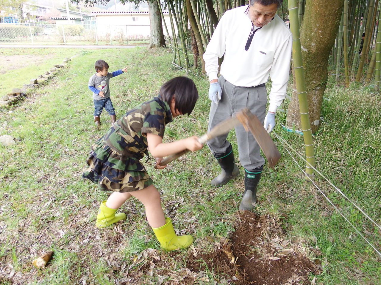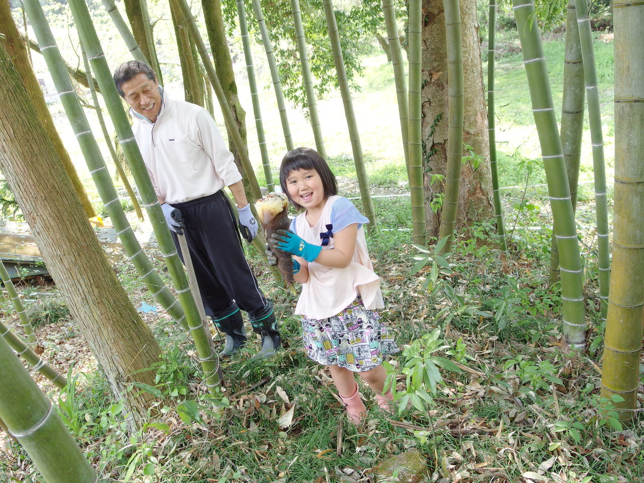 年々、子ども達も草の間からピョコッと頭を出しているタケノコを見つけるのが上手になってきました。そして、やはり自分で収穫すると、子ども達も、興味を持ちますし、よく食べてくれますね。育てたり、収穫したり・・・親は「買っちゃったほうが早い」とかつい思ってしまいがちですが、子ども達を見ていると、体験って大切だなぁ、とつくづく思います。