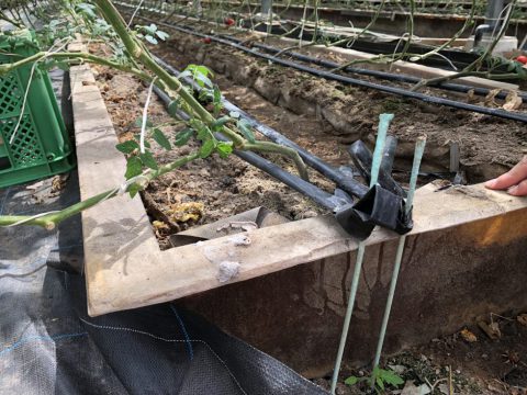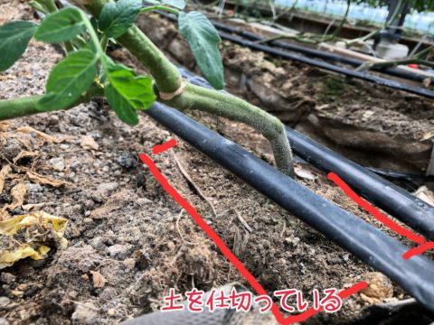 「さらに、一つ一つの苗は大きなポットに植えており、それをはめ込むように植えています。そうすることにより、ポットの側面が壁のようになるので、外からの病原菌が入りにくく、また必要な水や養分だけを十分に吸い上げられるような仕組みになっています。また、この苗は接木をせず、自根で栽培しています。自根で栽培すると病気のリスクは高まりますが、この定植の方法でリスクは最小限に抑えることができます。」ポットごと植えるなんて考えても見ませんでした。この栽培方法を「隔離床栽培」というそうです。この方法が、トマトの味にも繋がっているということでしょうか。