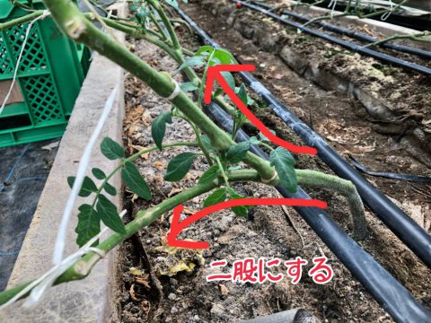 「トマトの栽培の過程にある脇芽取りをあまりやりません。一つの苗から二本の茎を成長させ、さらに一つの茎を二股に分けていくという栽培方法にしています。よくある栽培方法だと、実を20段ほど着けさせて行きますが、ここは5〜6段で生長点を止めます。そういう栽培方法でトマトの収穫量を多くしています。」