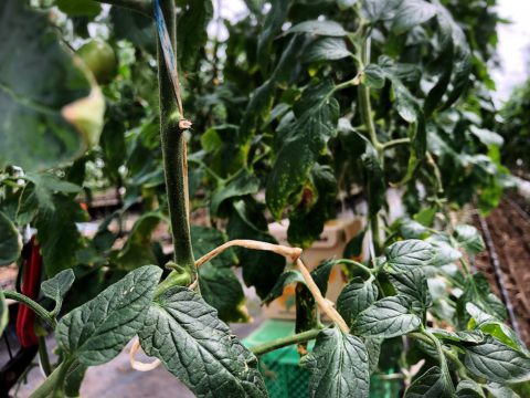 そして次に目に入ったのが、トマトの茎がまっすぐに吊るされていること。今までよく見ていた光景は、長く伸びていく茎を斜めに誘引する栽培方法でしたが、茎をまっすぐに吊るしているので、トマト自体の背丈が短いのです。この方法でトマトの収量が採れるのでしょうか?