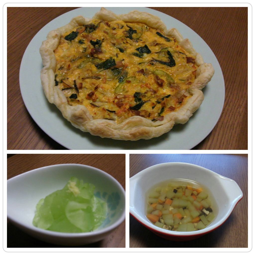 こちらの写真上のキッシュはパイシートを型に伸ばし加賀太きゅうりの薄切り玉ねぎ、 ベーコン、かぼちゃやマッシュルーム等を炒めて塩コショウ。茹でたほうれん草も加え、卵をほぐし豆乳、パルミジャーノを入れた物を加え 型に入れオーブンで焼きます。