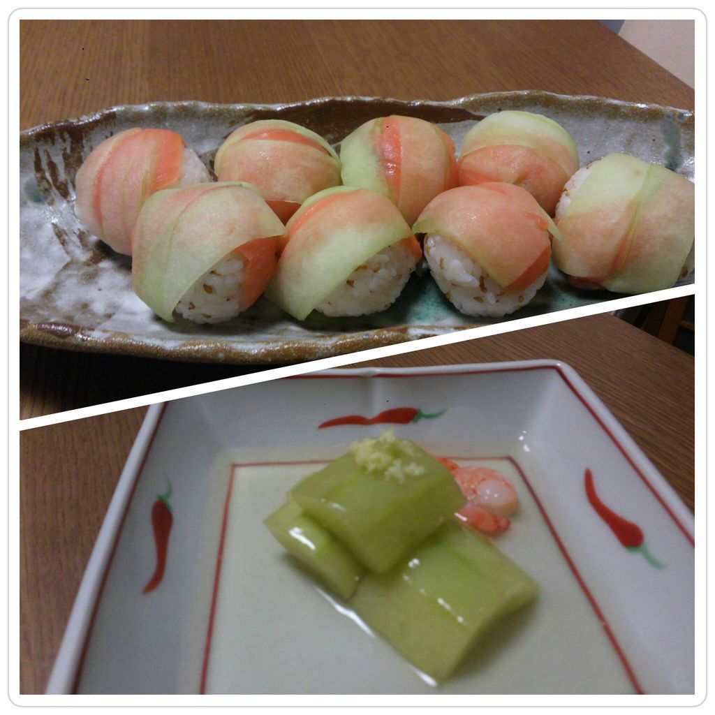 写真上は手まり寿司。ご飯にゴマと寿司酢を合わせ加賀太きゅうりをピーラーで薄くスライス したものに塩をふり、ラップに寿司飯、サーモン、加賀太きゅうりをのせ 丸くにぎります。
