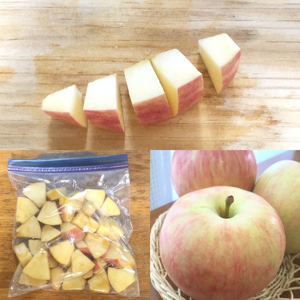程よい大きさにカットしたら、砂糖をまぶして冷凍保存袋に入れてぎゅーーーーと空気を抜きます。そして、冷凍庫へ。ここまでしておけばいつでも食べたいときにすぐ!アップルパイが作れますね。