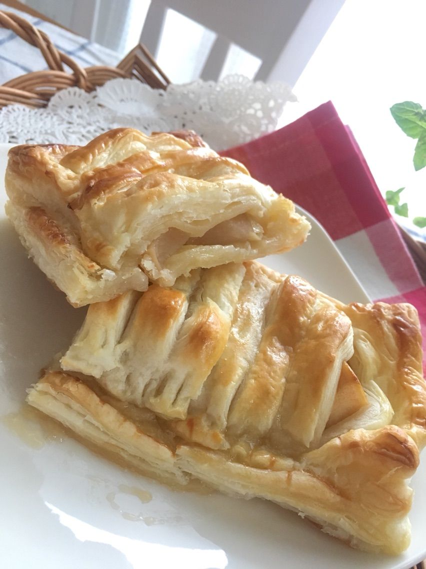 我が家では市販の冷凍パイシートにはさんで焼くだけですが・・・とってもおいしくできました! 冷凍することで繊維が壊れ、りんごはトロ、プルッ。いつも作るアップルパイとちょっと違う食感です。