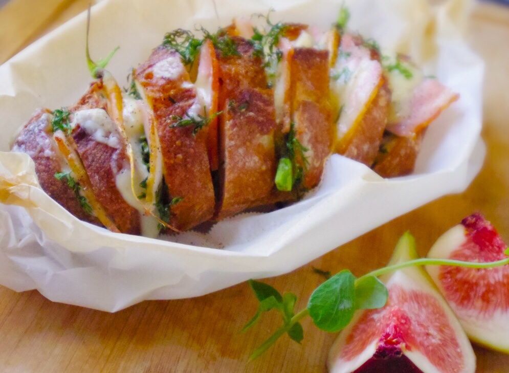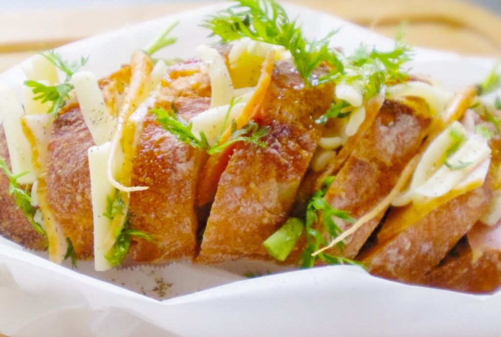 セリ科で香り高い人参の葉は チーズとの相性がバッチリ。カットしたバケットに人参の葉と 小さな人参・チーズ・ベーコンを はさんでオリーブオイルとお塩少々 ブラックペッパーをふりかけて。