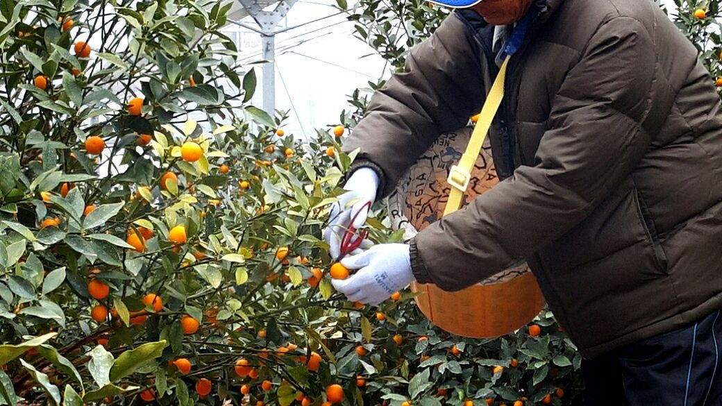 糖度、色づきをクリアした金柑を一つ一つ見極めていきます。収穫の際にも金柑の枝や果実に細心の注意を払いながら、ゆっくりと作業を進めていきます。