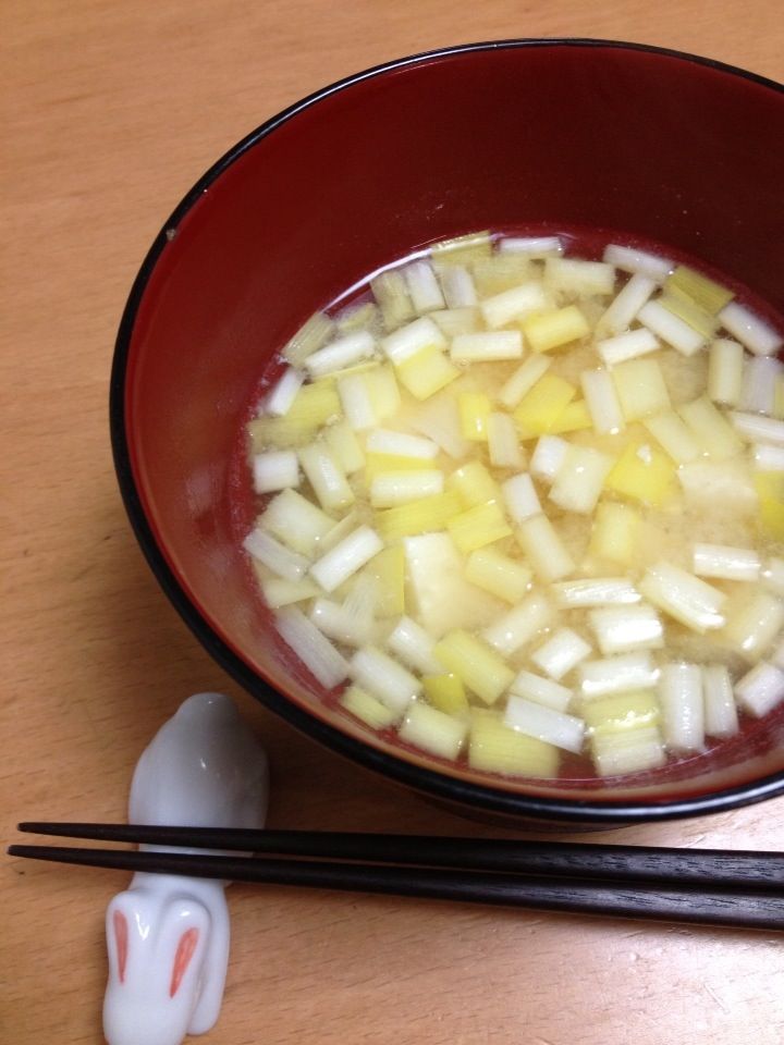 ベーシックに、黄にらのお味噌汁火を止めたところへ短めに切った黄にらを入れて余熱で火を通すのがポイント