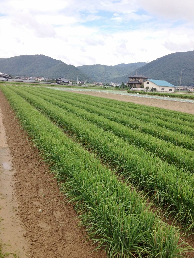 (青にらがしっかり育っている夏の畑)通常の青いにらを一旦植えて、しっかりとした株を育てます(もったいないけれど青い部分は切ってしまいます)