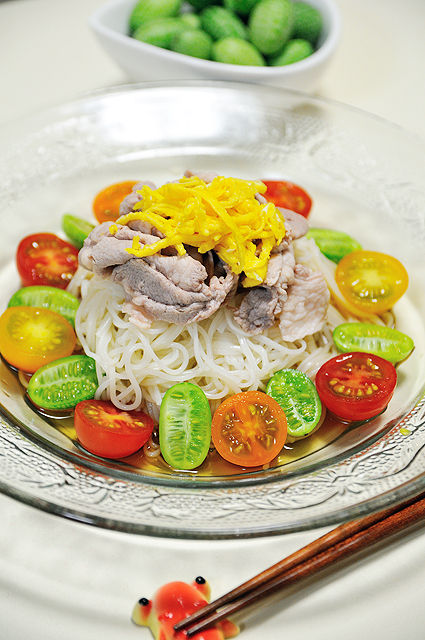 サラダそうめんにも添えてみました。種のほうを上に向けると、まるでトマトと見分けがつかなくなってしまいました(笑) 豚肉の冷しゃぶと錦糸玉子をトッピングして、そうめんつゆを回しかけるぶっかけスタイルでいただきました。