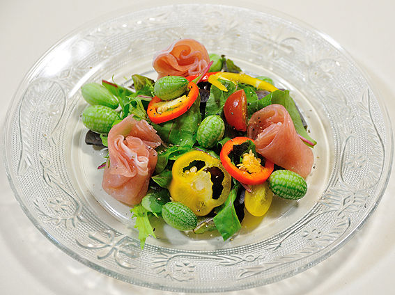 サラダのきゅうり、まだ切って使ってるの??そんなキャッチフレーズを楽しげに披露してくださった生産者の山下さん。いつものサラダに「切らずに使うきゅうり」を添えてみました。鮮やかなオレンジと黄色はスティックパプリカ。フレッシュグループ淡路島の提携メンバーさとう農園さんから分けていただいたもの。甘くてジューシー、種もまるごと食べられるということで、種つきのままザクザクと切って一緒に盛り付けました。
