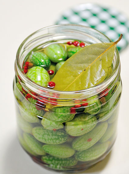 きゅうりといえば、定番のピクルス。実自体にも酸味がありますが、お酢、お水、塩、砂糖、ローリエやピンクペッパーを入れ、加熱してピクルス液を作りました。熱いうちにビンに注ぎます。
