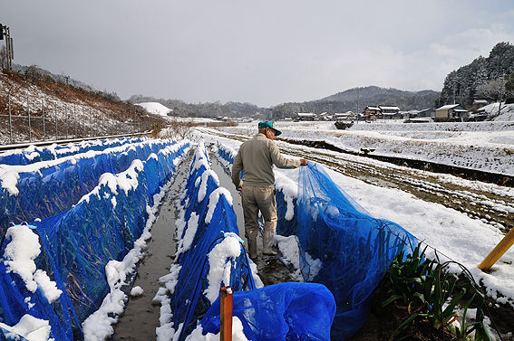 兵庫県朝来市周辺の但馬エリアは、降雪量の多い地域で、岩津ねぎの栽培には、雪除けネットを使用します。江戸時代末期、岩津ねぎは生野銀山で働く人々の冬の栄養源として食べられていたといい、古くからこの地域で愛され続けてきた品種です。独特の辛味成分、硫化アリルには消化促進や抗菌作用があり、緑色の葉の部分には、ビタミンB群も豊富に含まれています。疲労回復やカラダを温める作用があり、ねぎ内部のとろりとした卵白のような粘り成分には、粘膜を保護する働きも。そしてこの粘り成分のおかげで、氷点下でも凍らず、雪のなかで栽培できるのだそう。