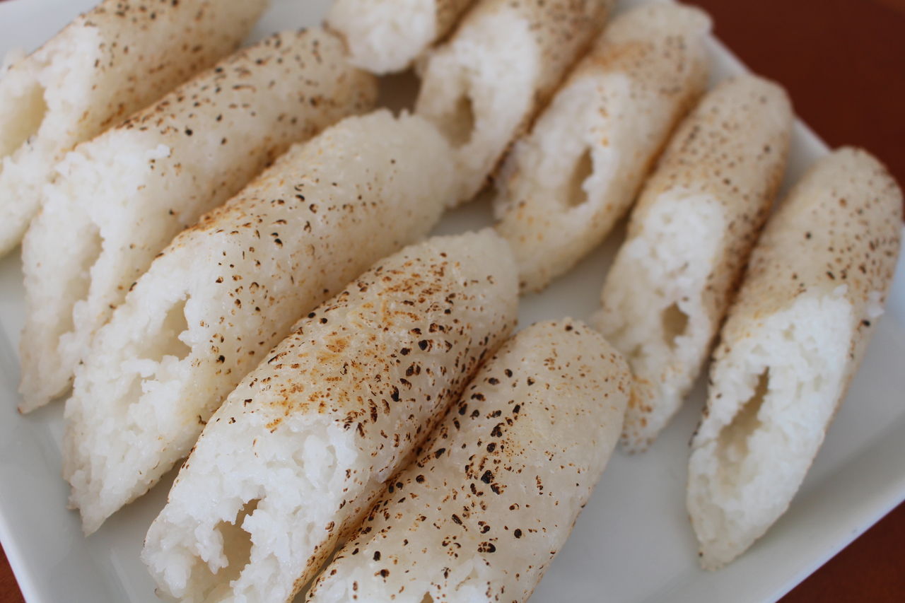 串は秋田杉でできています。出来上がりはほんのり杉の香り。これをこんがりと焼きます。囲炉裏に刺して焼けるように串がとがっていますが・・・我が家はないので、ホットプレートで。串が長いので、斜めで2本ずつ、串を回しながら焼き目をつけます。