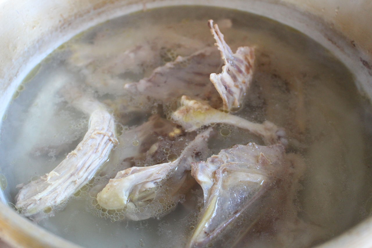カットして、鍋に入る長さにします。これで「きりたんぽ」は完成。次は、鍋のスープ作りです。比内地鶏のガラを使って、とびきり美味しい出汁を取ります。