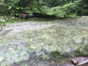 自然に近い状態で沢沿いに作られたわさび田では、防虫ネットで物理的に虫やシカを遮断し、農薬を使わずにわさびを育てているそうです。