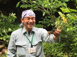 わさびを引き抜き、わさびの育ち方を話してくださる堀さん。笑顔が素敵です。
