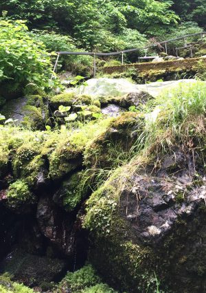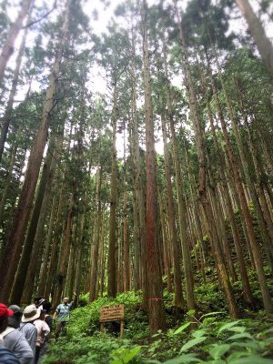 15分ほど杉林の中の山道を登り、急な坂道を上がって丸太の橋を渡ると…